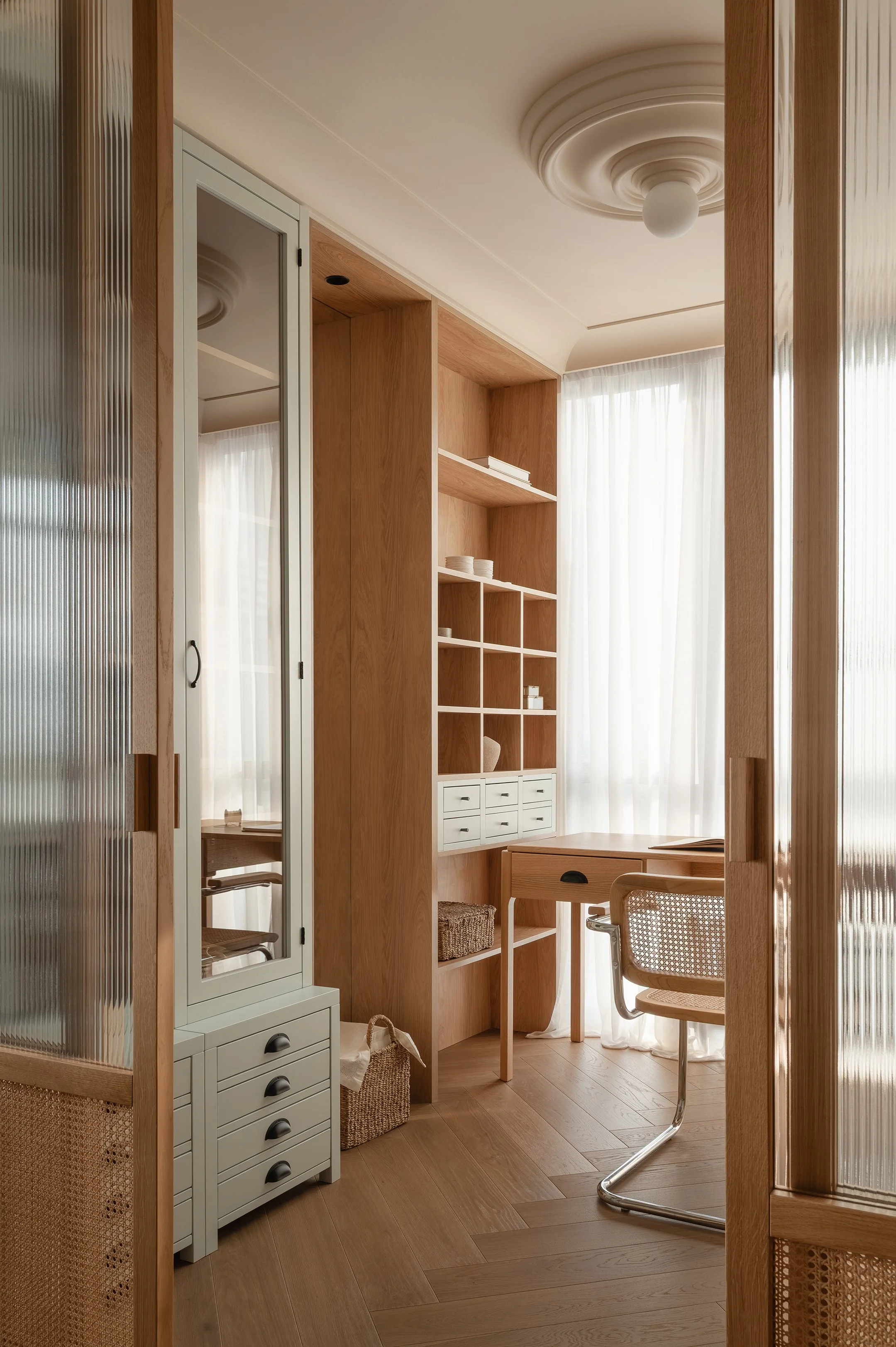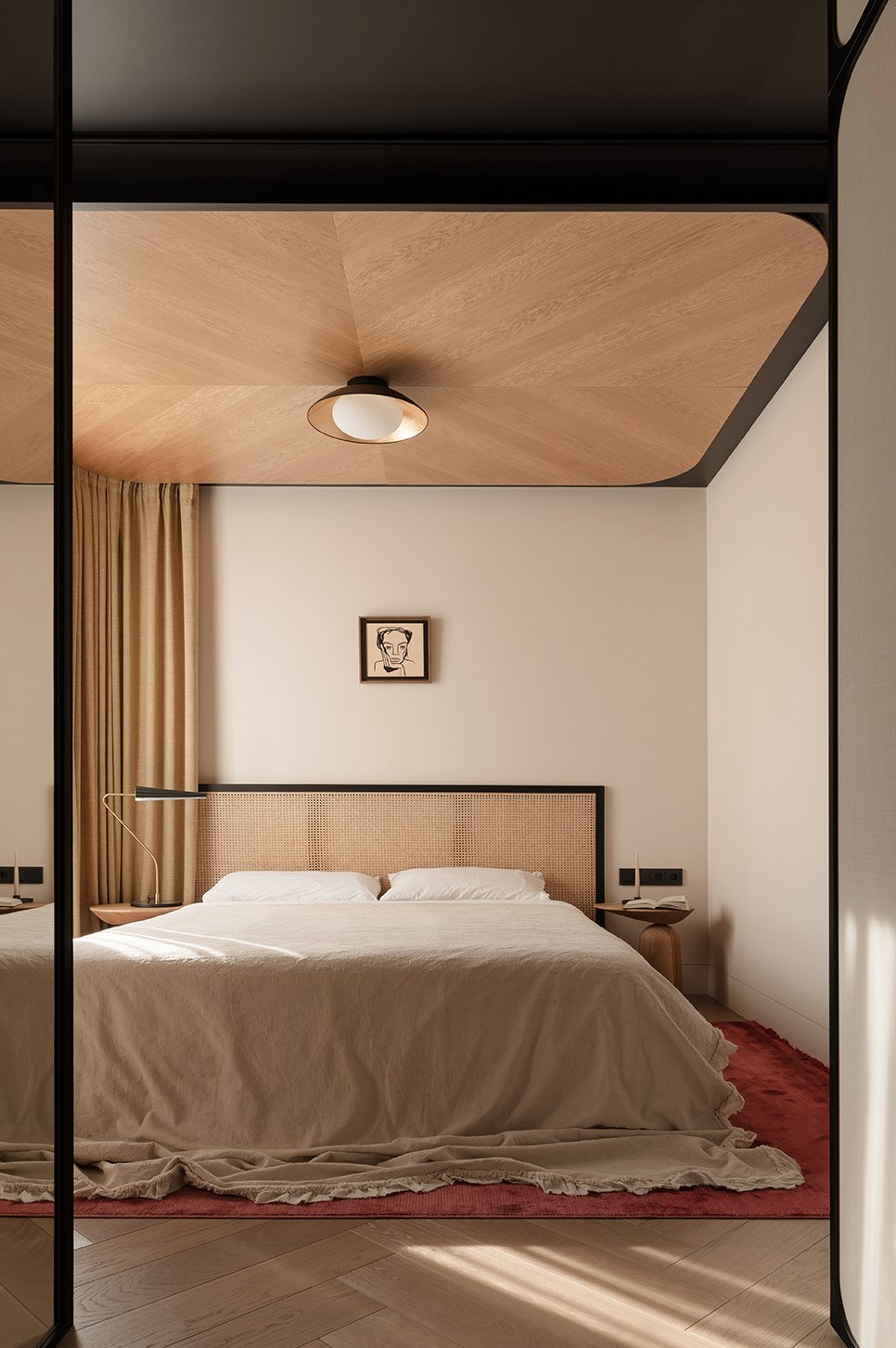 We deliberately avoided separating the walls from the ceiling: a single tone flows seamlessly from the walls onto the ceiling, creating a cohesive background effect and a sense of volume. The only exception is the master bedroom. Here, wooden veneer panels on the ceiling add a special sense of coziness, while textured wallpaper with a landscape motif on some of the walls creates a more intimate, private atmosphere.