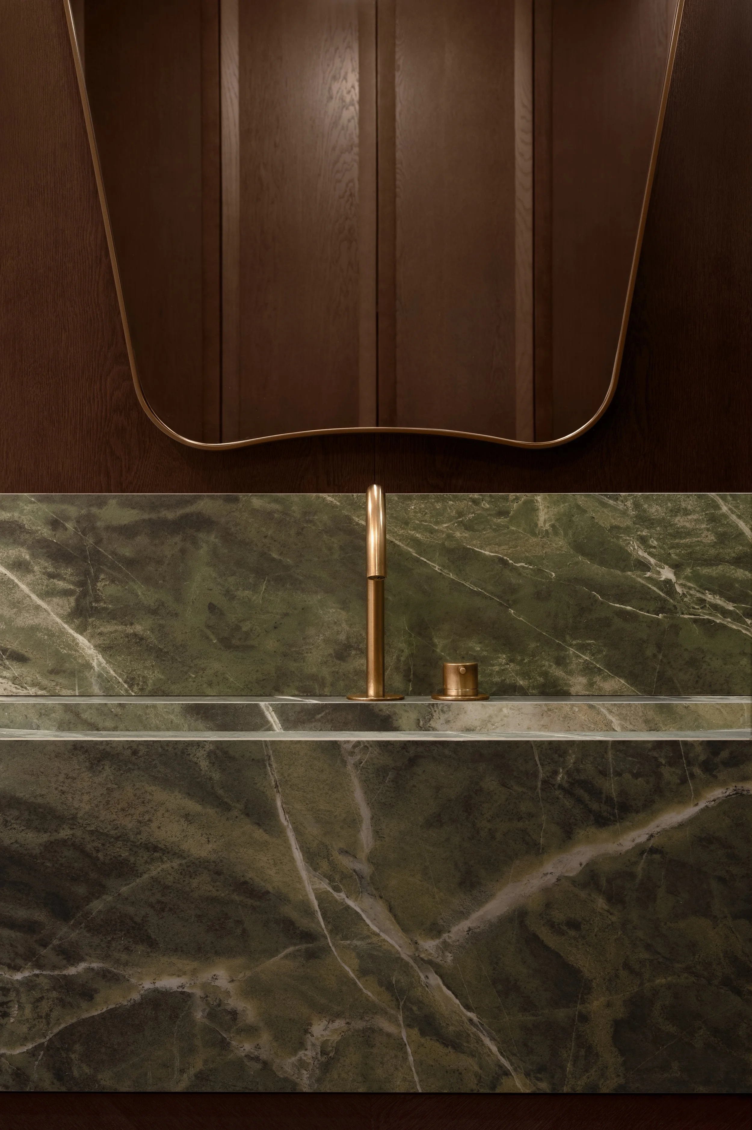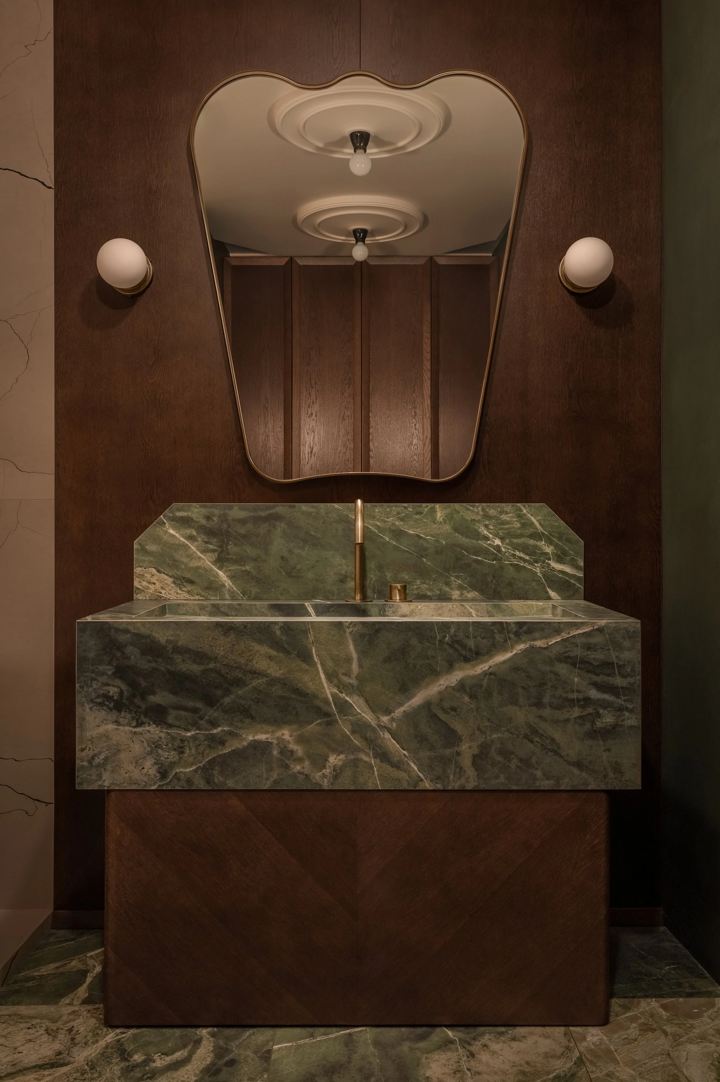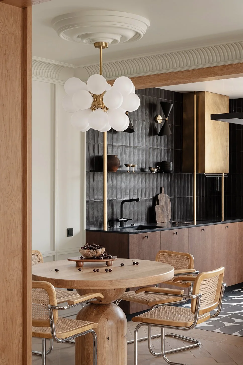 Classical elements — cornices, symmetry, and elegant silhouettes — are thoughtfully reinterpreted through a contemporary lens. The interior delicately weaves together textures of natural stone and minimalist porcelain stoneware, while American walnut veneer is paired with sculptural elements crafted from solid natural wood. This interplay creates a rich, multi-layered tactility that invites closer exploration and appreciation.