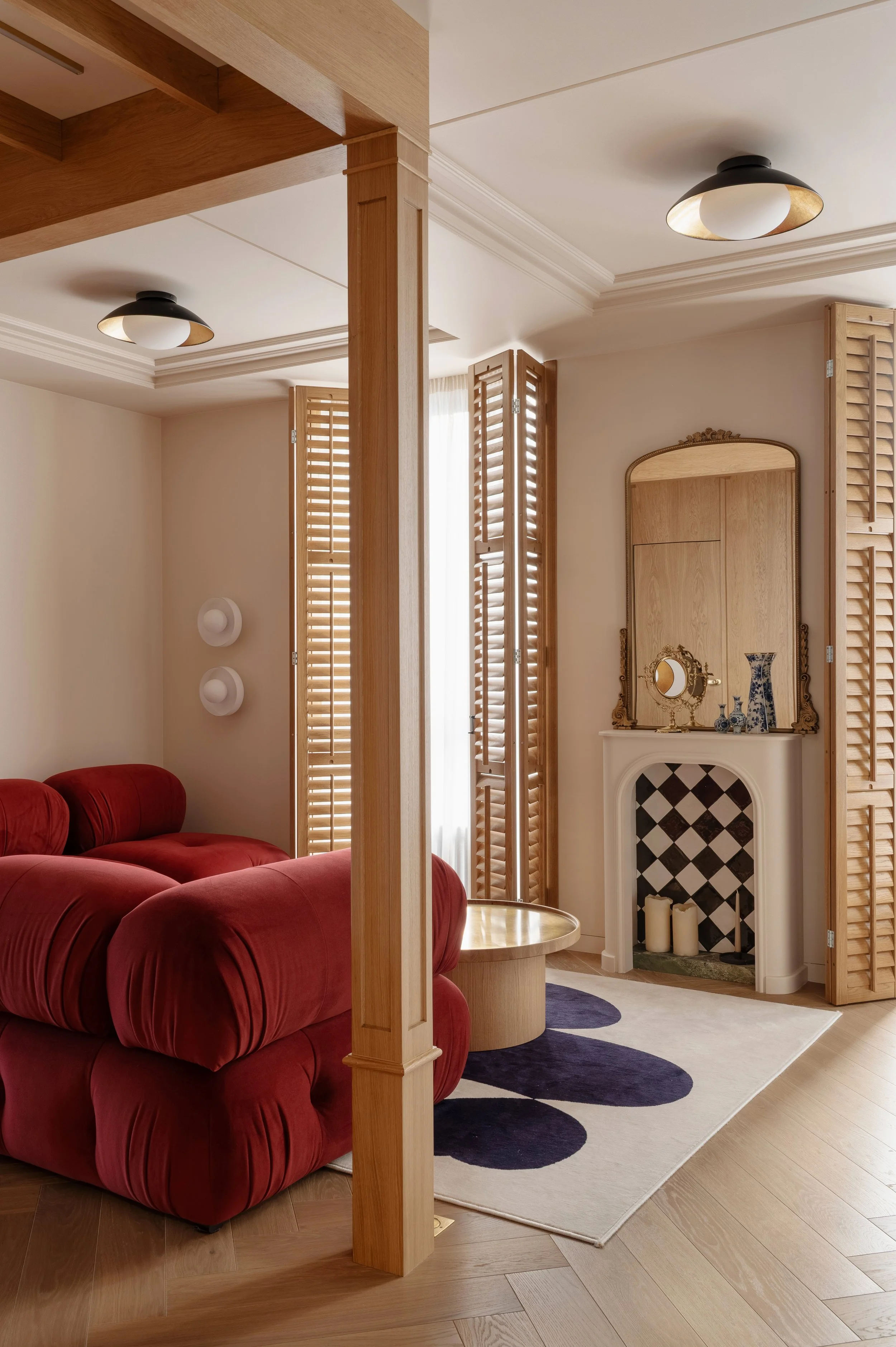 This interior is a fusion of refined French classicism and expressive eclecticism, where every detail speaks of character, style, and boldness.The space feels deep and layered: a burgundy velvet sofa immediately captures attention, becoming the emotional focal point of the studio. Its насыщенный тон creates a dramatic contrast against the neutral wall palette and natural materials, adding depth and sensuality to the composition.