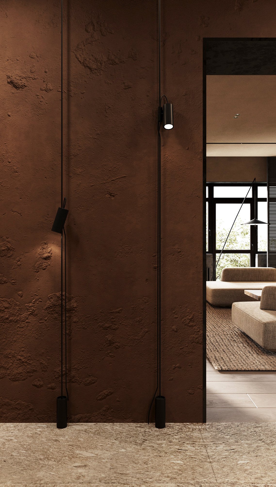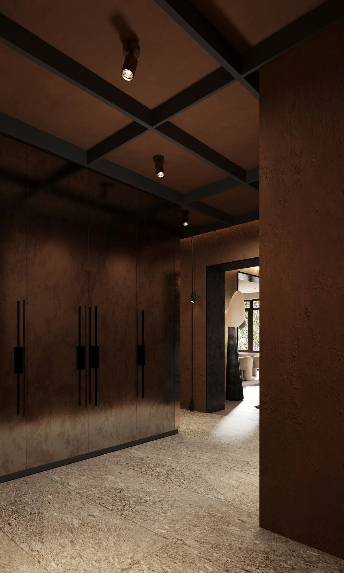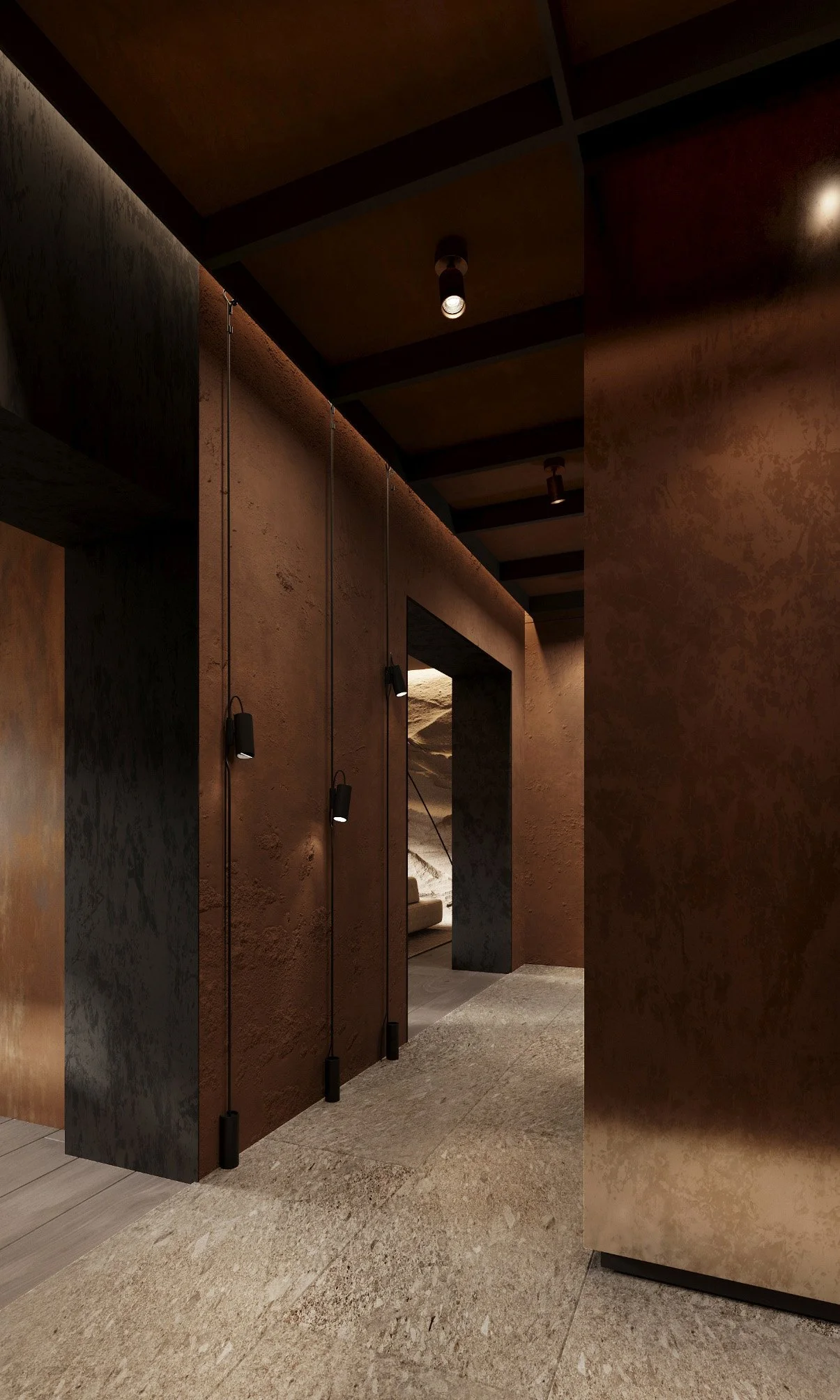 The corridor is a monumental yet accentuated space, highlighted by earth-textured plaster, cabinets with metallic plaster fronts, black lighting fixtures, and stone-effect tiles.